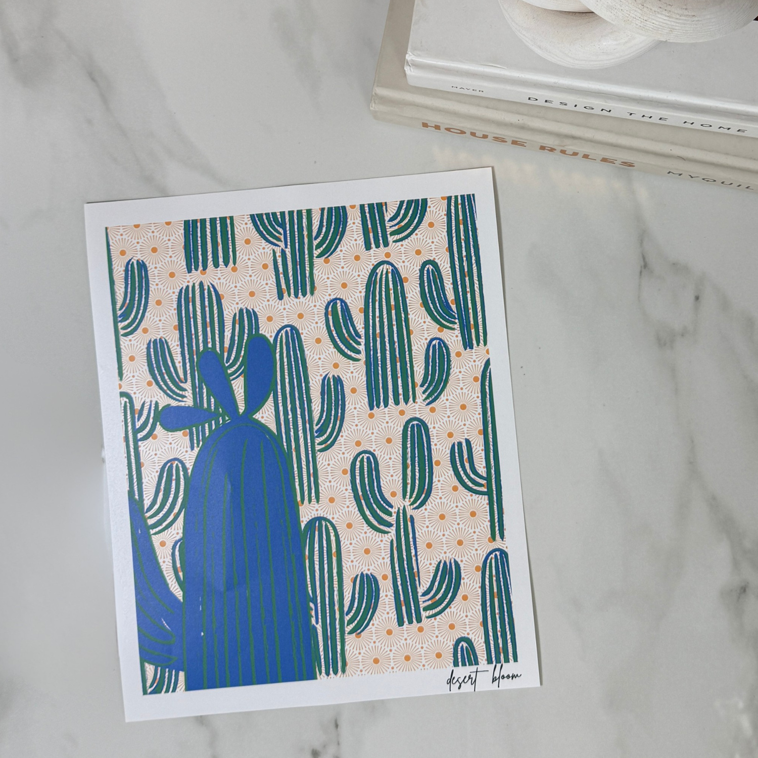 Your space should feel like you. Inspired by sun-drenched landscapes and desert wanderings, this vibrant art print brings a sense of warmth and whimsy to any room. Playful cactus forms in hand-drawn lines and layered hues of blue and green create an uplifting contrast against a soft, patterned backdrop—perfect for adding personality to your walls.