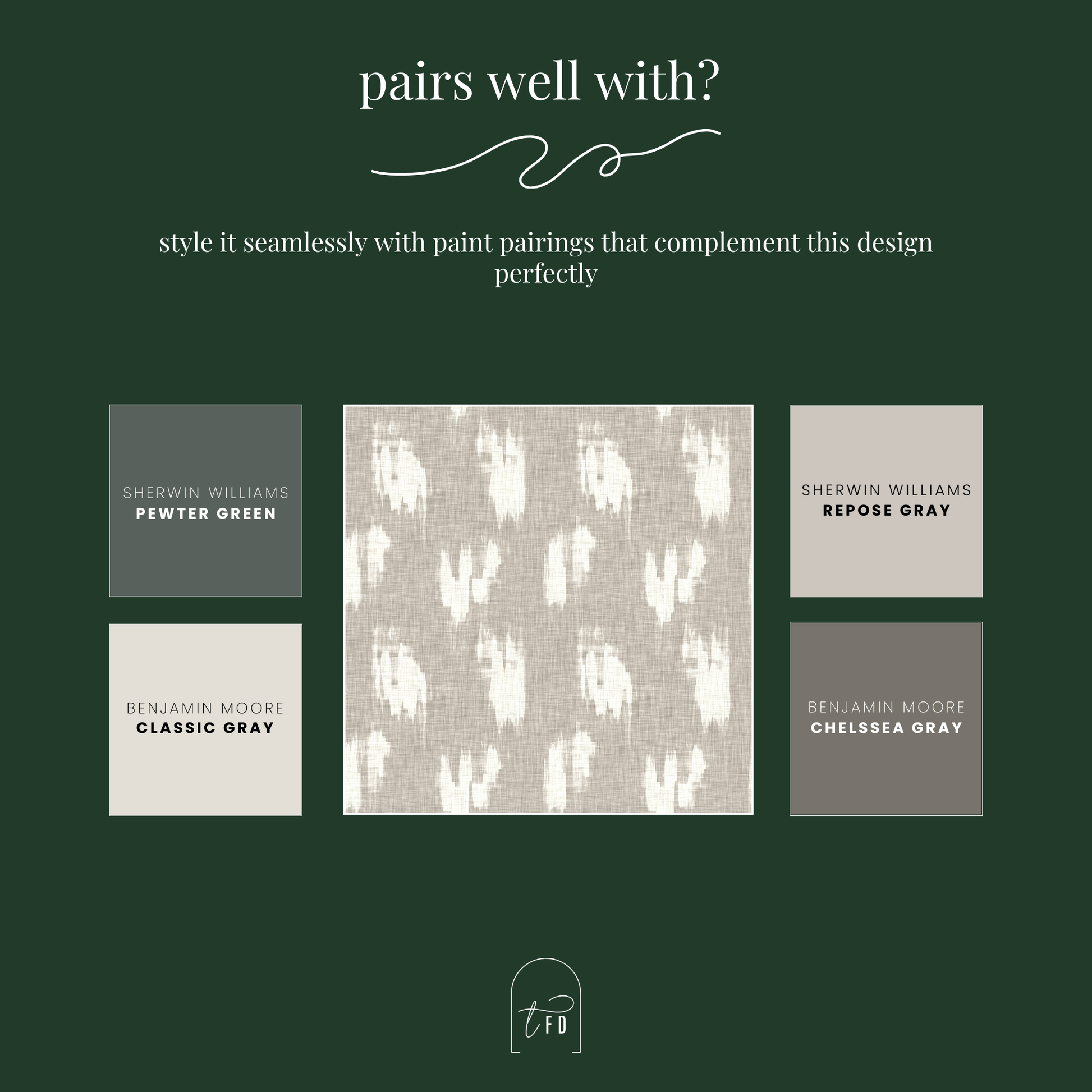 This design features a soft gray motif inspired by woven textiles and ikat patterns. Its layered look adds depth and dimension while remaining versatile enough to complement both contemporary and classic interiors. The subtle variation in tone makes Driftmark a perfect choice for cozy neutrals, layered gray palettes, or moody accents like deep greens and charcoals.
