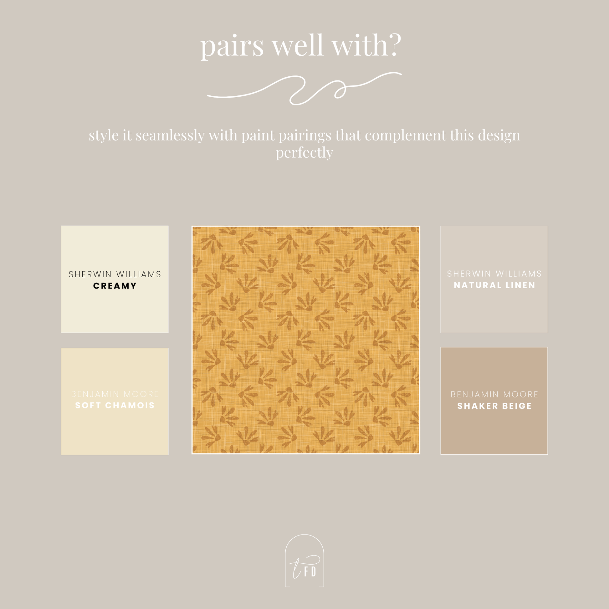 Suggested paint colors include Sherwin Williams Creamy, Sherwin Williams Natural Linen, Benjamin Moore Soft Chamois, and Benjamin Moore Shaker Beige. These shades enhance the golden palette while keeping the overall look warm, relaxed, and cohesive.
