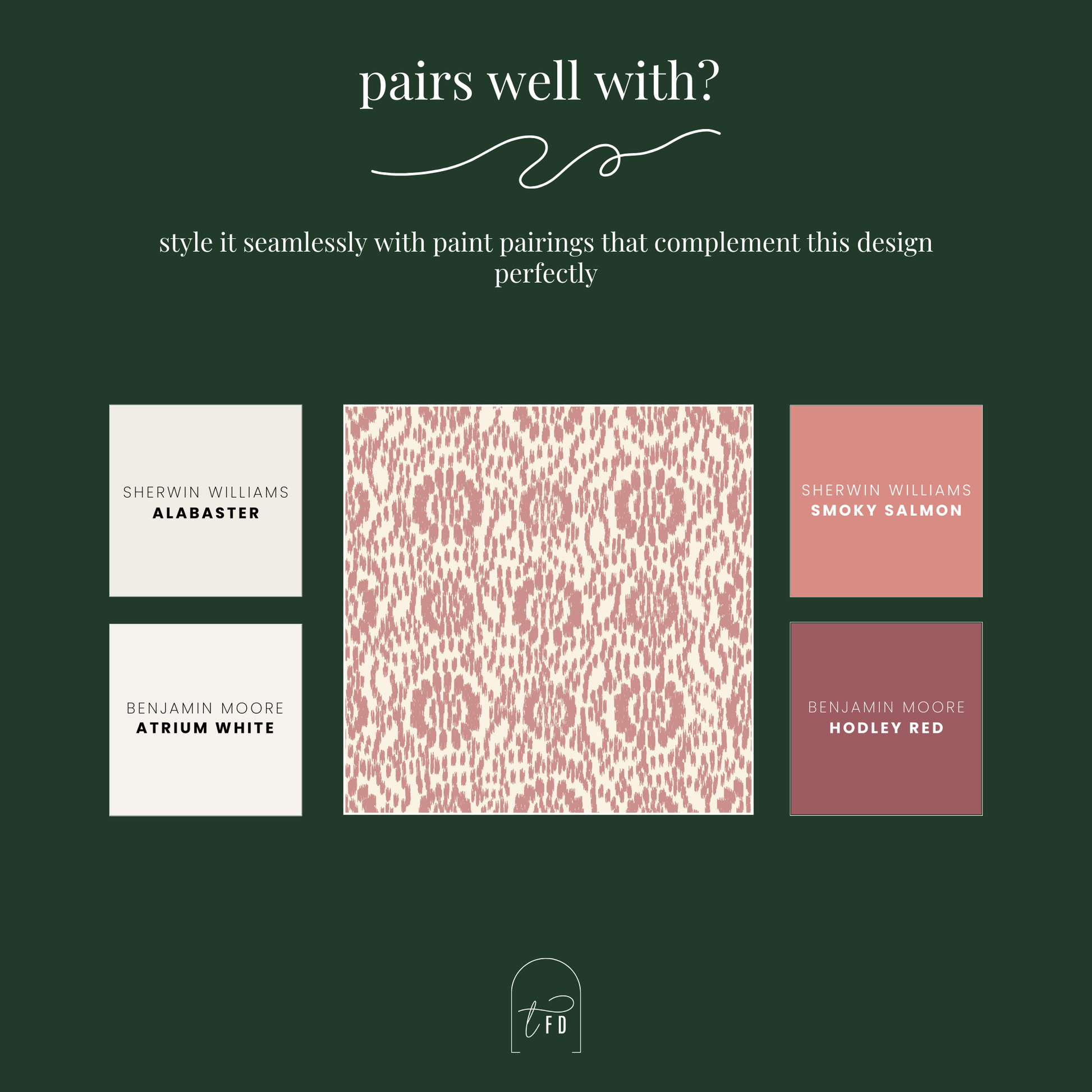 Elevate your look by coordinating Rosewood Threads Wallpaper with designer paint colors that highlight its rosy tones. For a soft and timeless backdrop, Sherwin-Williams Alabaster (SW 7008) and Benjamin Moore Atrium White (OC-145) create a warm neutral base. For added depth, Benjamin Moore Hodley Red (HC-65) and Sherwin-Williams Smoky Salmon (SW 6331) echo the dusty rose palette with richness and balance.