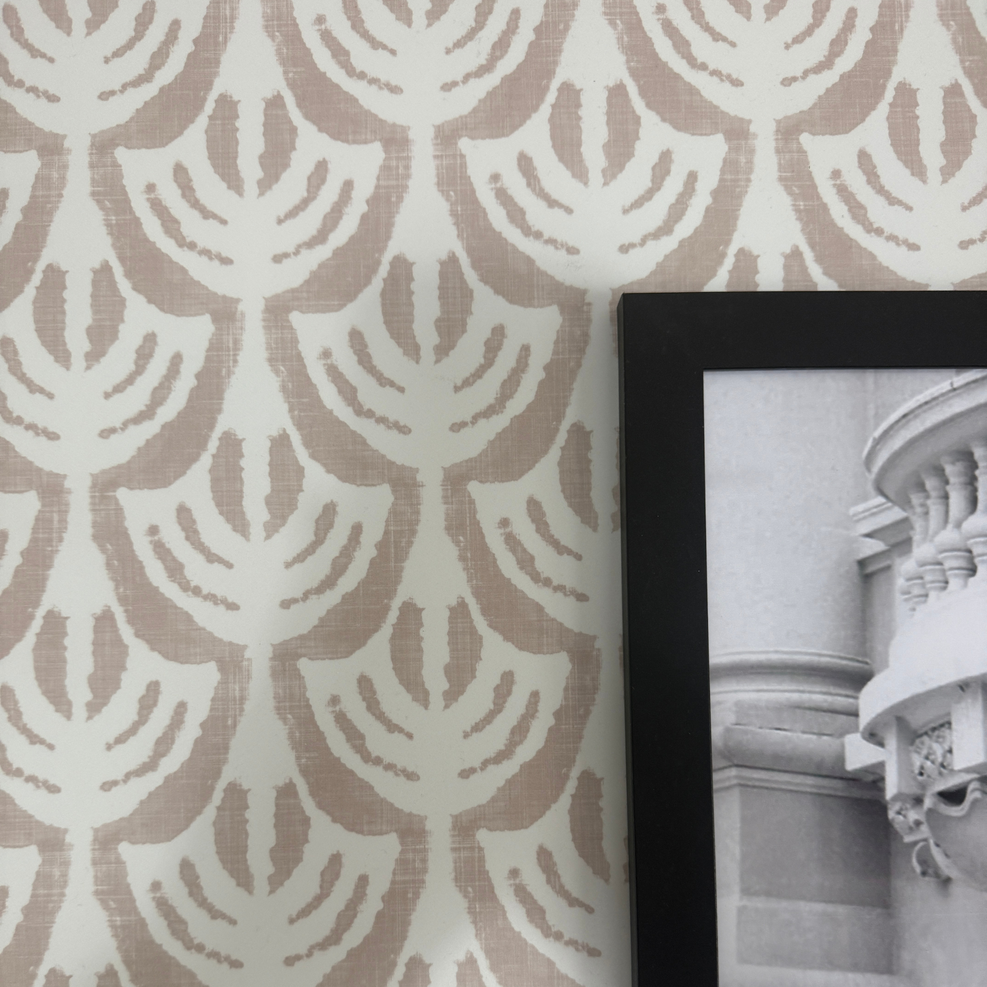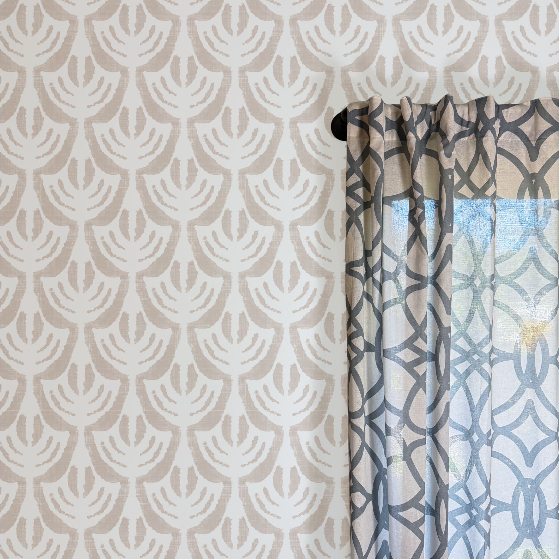 This design features a stylized laurel motif inspired by traditional ikat textiles, reimagined in a soft taupe palette. The neutral yet distinctive pattern adds warmth and texture while staying versatile enough to complement both modern and timeless interiors. Its understated color variation makes it the perfect backdrop for cozy neutrals, bold accent colors, or metallic finishes like brushed gold and brass.