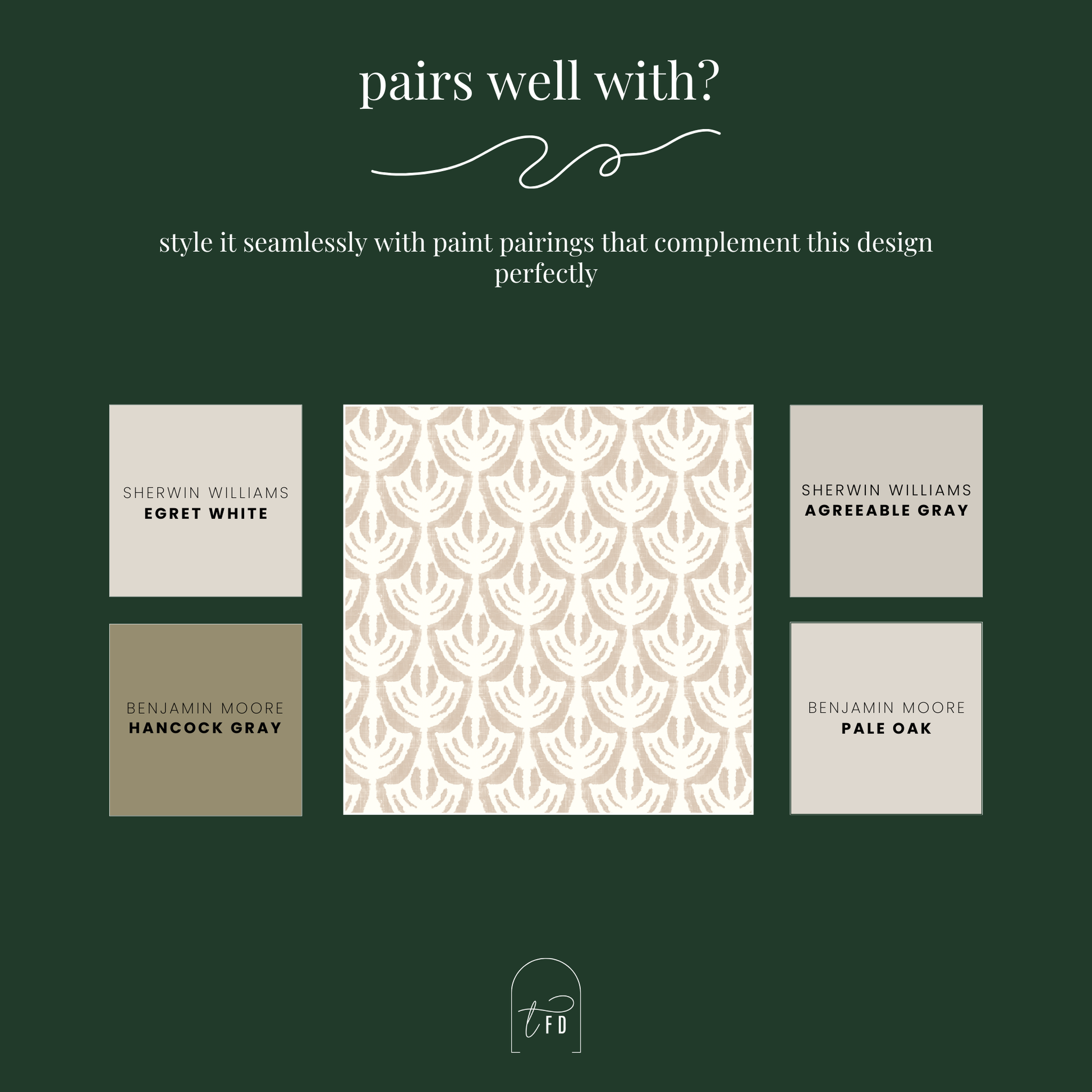Elevate your look by coordinating this Taupe Laurel Ikat Wallpaper with timeless paint colors. For a soft and seamless backdrop, try Sherwin Williams Egret White or Sherwin Williams Agreeable Gray. For added depth, Benjamin Moore Hancock Gray and Benjamin Moore Pale Oak provide rich, balanced contrast. To complete the look, layer in art pieces that echo the same elevated palette. Our Soft Sand Bloom Arch Wall Art introduces subtle texture and warmth, while the Coastal Layers 4 Piece Blue Art Print Set adds a refined coastal vibe that ties everything together.